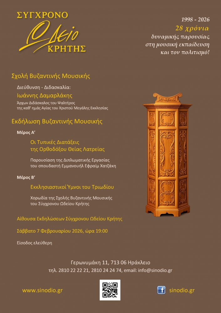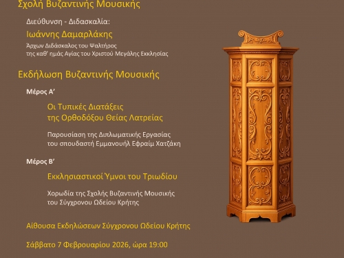 Η Σχολή Βυζαντινής Μουσικής του Σύγχρονου Ωδείου Κρήτης διοργανώνει εκδήλωση με αφορμή την παρουσίαση της διπλωματικής εργασίας του σπουδαστή Εμμανουήλ Εφραίμ Χατζάκη, το Σάββατο 7 Φεβρουαρίου 2026 και ώρα 19:00, στην αίθουσα...
