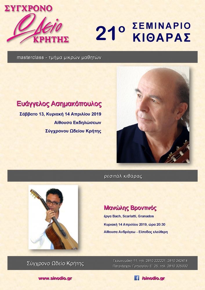 Στιγμιότυπα από το 21ο ΦΕΣΤΙΒΑΛ ΚΙΘΑΡΑΣ που διοργάνωσε το Σύγχρονο Ωδείο Κρήτης στις 13 και 14 Απριλίου 2019 με τον διεθνούς φήμης σολίστ και μουσικοπαιδαγωγό Ευάγγελο Ασημακόπουλο.