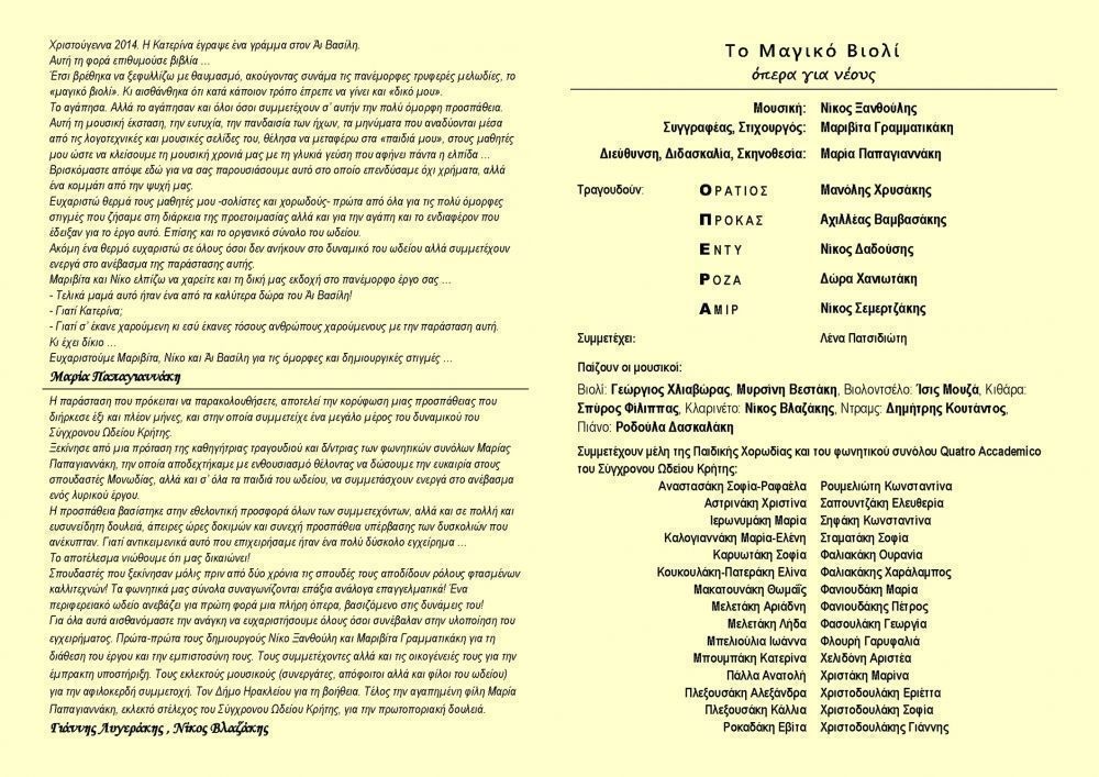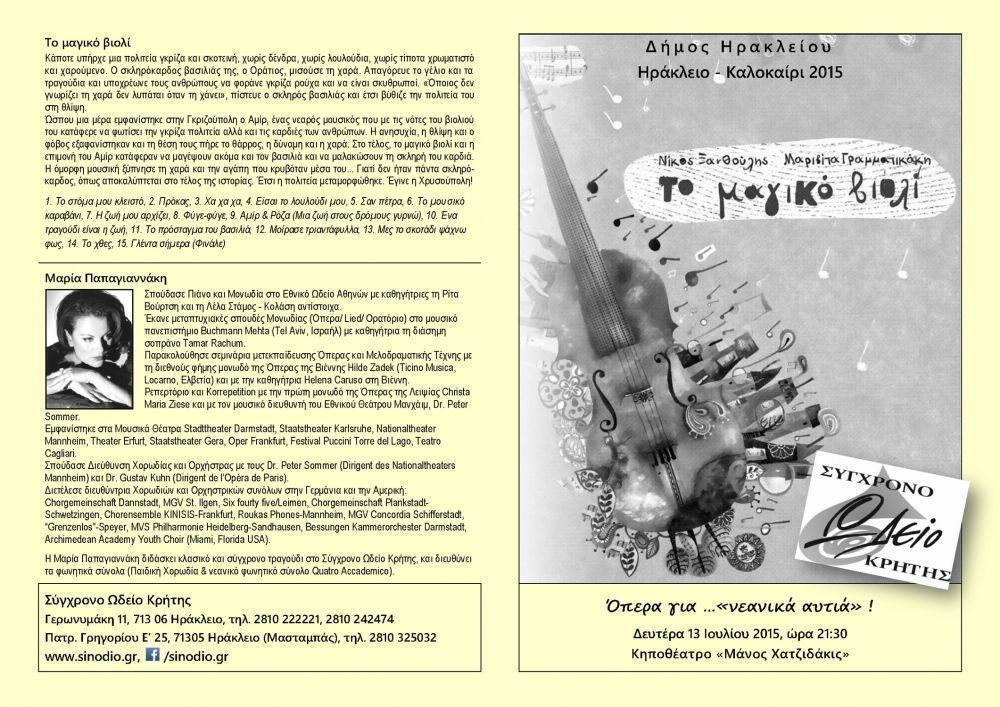 Μουσική: Νίκος Ξανθούλης, Συγγραφέας- Στιχουργός: Μαριβίτα Γραμματικάκη, Διεύθυνση-Διδασκαλία: Μαρία Παπαγιαννάκη