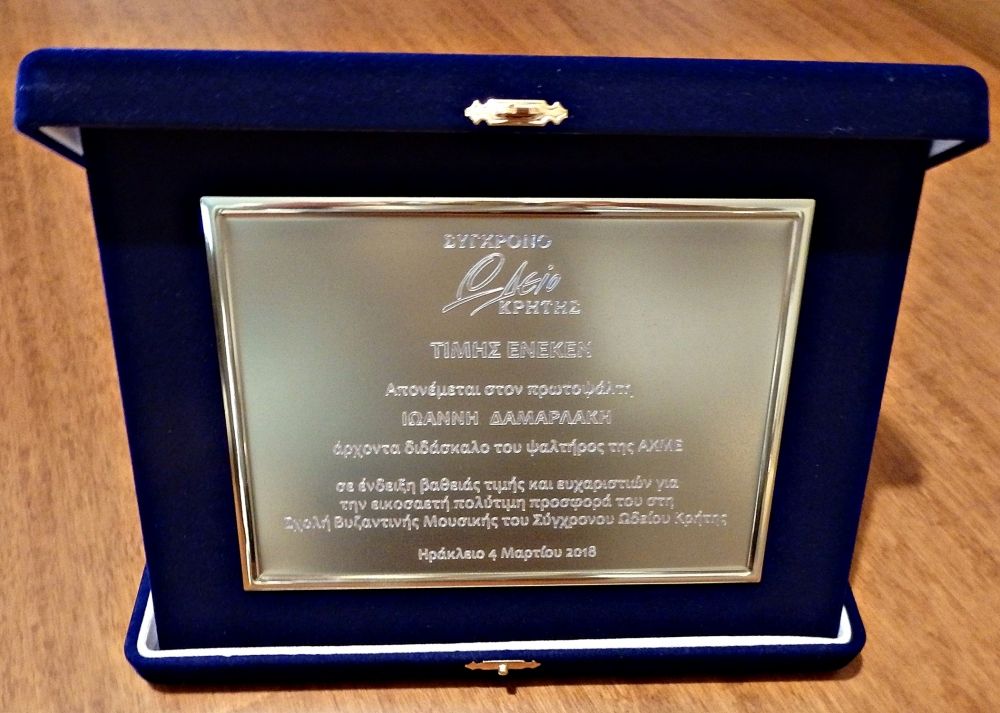 Κατά τη διάρκεια της εκδήλωσης η διεύθυνση του Σύγχρονου Ωδείου Κρήτης τίμησε τον Γιάννη Δαμαρλάκη για την εικοσαετή πολύτιμη προσφορά του στη Σχολή Βυζαντινής Μουσικής.