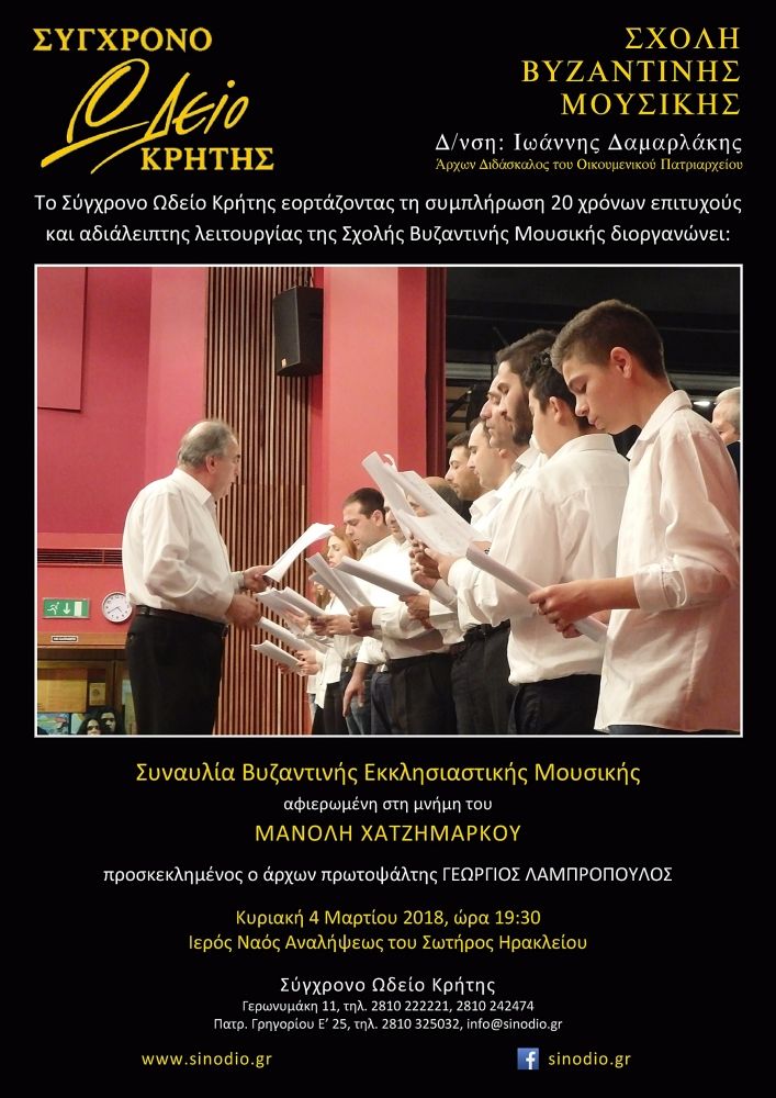 Στιγμιότυπα από την επετειακή συναυλία για τα 20 χρόνια λειτουργίας της Σχολής Βυζαντινής Μουσικής του Σύγχρονου Ωδείου Κρήτης, που πραγματοποιήθηκε την Κυριακή 4 Μαρτίου 2018 στον Ι. Ν. Αναλήψεως του Σωτήρος Ηρακλείου και ήταν αφιερωμένη στο έργο του Μανόλη Χατζημάρκου.