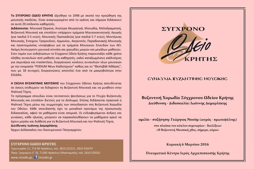 Στιγμιότυπα από τη συναυλία Βυζαντινής Μουσικής που διοργάνωσε το ΣΥΓΧΡΟΝΟ ΩΔΕΙΟ ΚΡΗΤΗΣ, την Κυριακή 6 Μαρτίου 2016, στο Πνευματικό Κέντρο της Ιεράς Αρχιεπισκοπής Κρήτης.